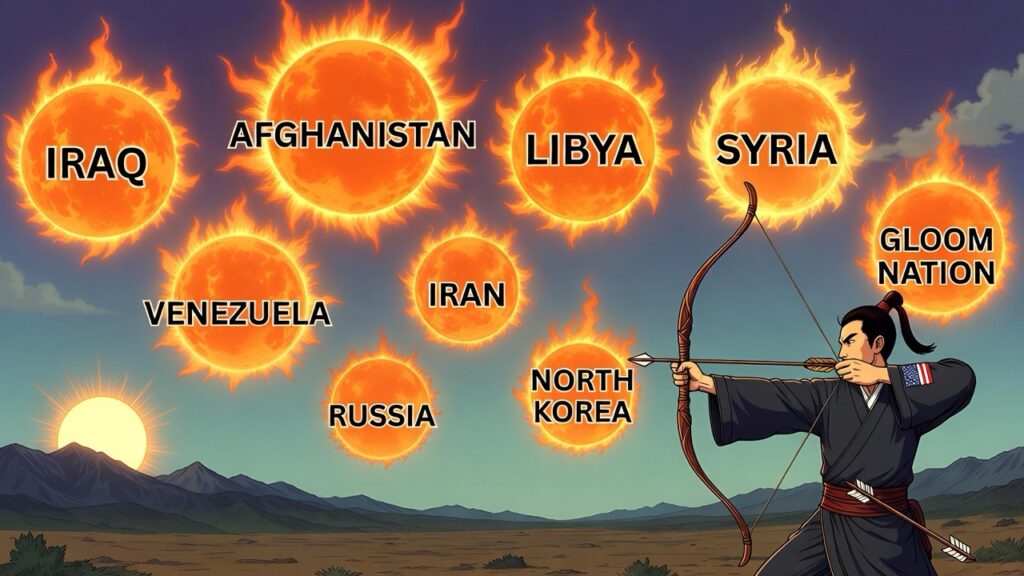 In the context of contemporary geopolitics, this myth has been cleverly repurposed by netizens as a form of dark humor satire. If we liken the United States to Hou Yi holding the divine bow, then the nine “suns” represent those forces causing global “overheating”—often characterized by authoritarianism, expansionist ambitions, and the trampling of universal values, manufacturing conflict, suppressing freedom, and threatening stability. America’s “arrows” symbolize the use of diplomacy, economic sanctions, alliance realignment, and military intervention to weaken these destructive forces and safeguard an international order based on democracy, rule of law, and human rights.